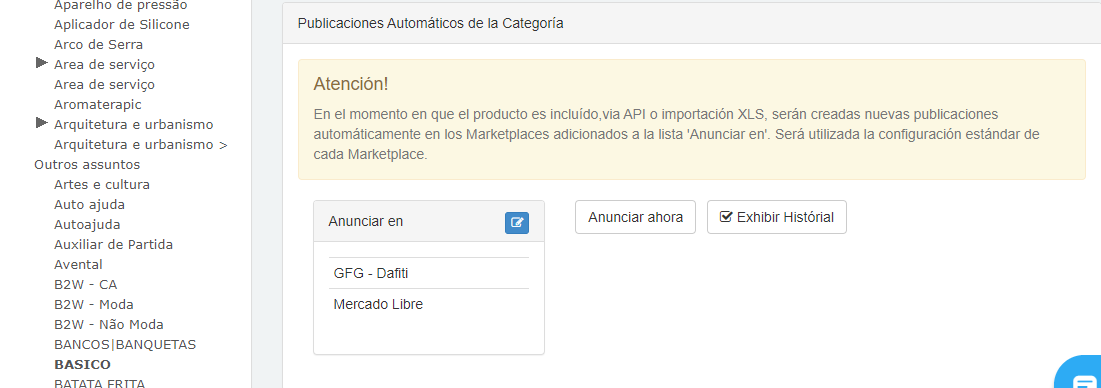 En ese botón, después de seleccionar el Marketplace para publicación, ANYMARKET pasa por toda la categoría y realiza la transmisión de los productos para los Marketplaces señalados para publicación automática. Los nuevos productos que se registren y que pertenezcan a esa categoría se van a transmitir automáticamente.