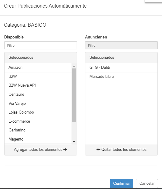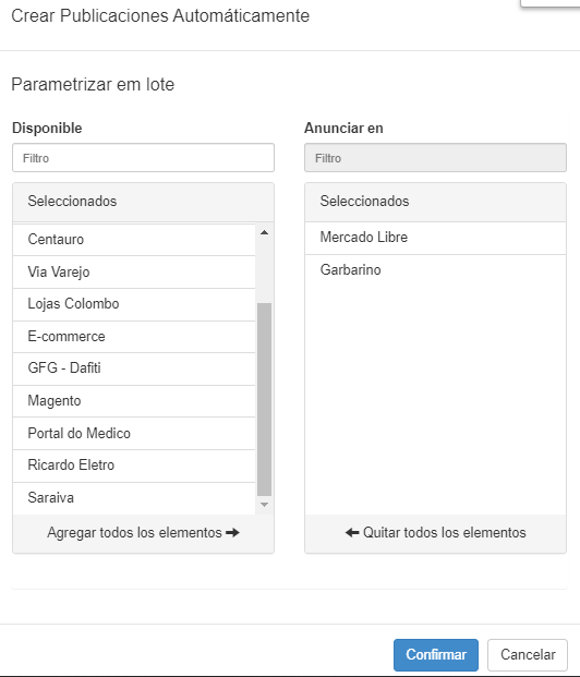 En ese ejemplo, seleccionamos los Marketplaces Mercado Libre y Dafiti.