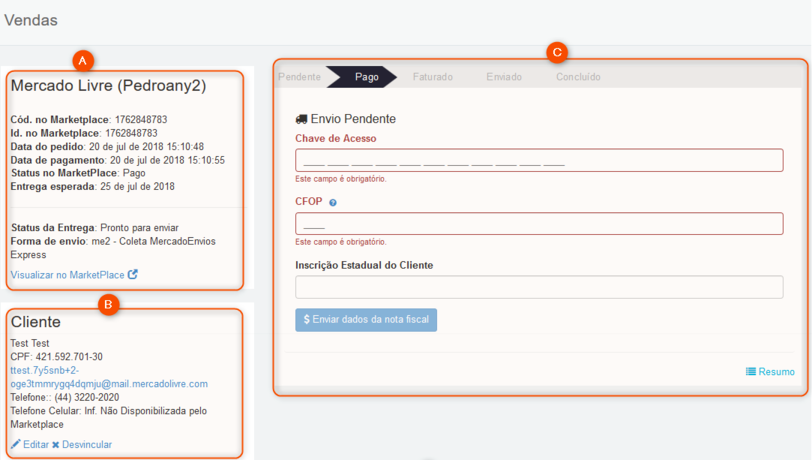 Dados da venda: Campo onde serão informados os dados solicitados pelos marketplaces, como dados de nota fiscal, de envio e entrega do pedido.