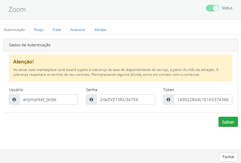 - Token: Insira o token do ANYMARKET, você conseguirá o token no menu Configurações > Perfil > Minha Conta.