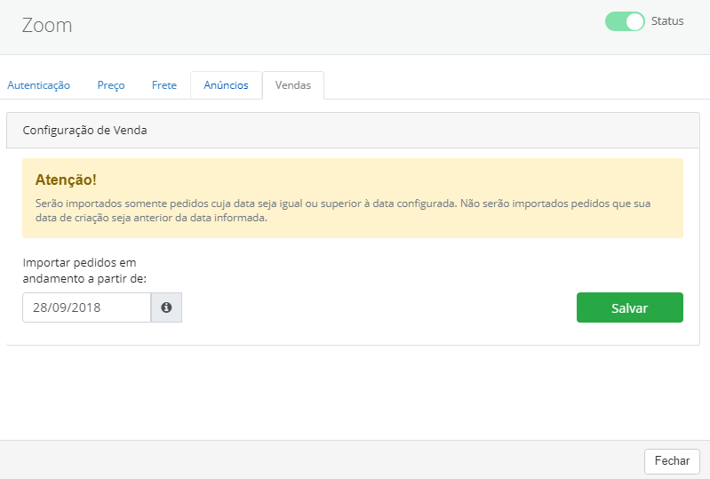 10. Em Configurações de importação de vendas, selecione uma data para o início da importação de pedidos;