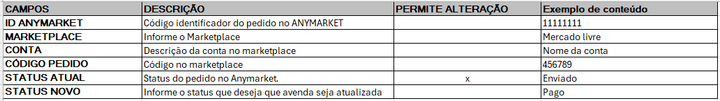 O preenchimento de todas as colunas da planilha é obrigatório para realizar a alteração do status do pedido.