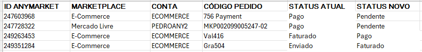 Na coluna STATUS NOVO, informe o status para o qual deseja voltar o pedido. Essa coluna aceita apenas os seguintes valores: