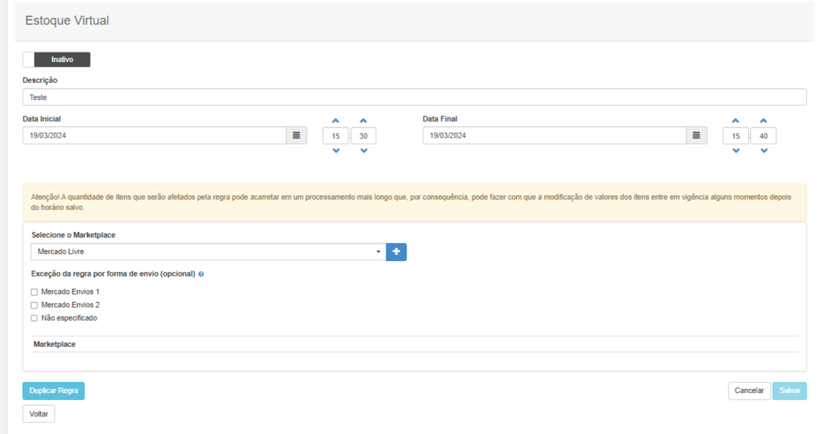 Ao clicar em salvar a regra entrará em vigor de acordo com o período de vigência configurado. Enquanto a regra de estoque virtual estiver vigente, o ANYMARKET não enviará para os Marketplaces o estoque do SKU declarado no local virtual.