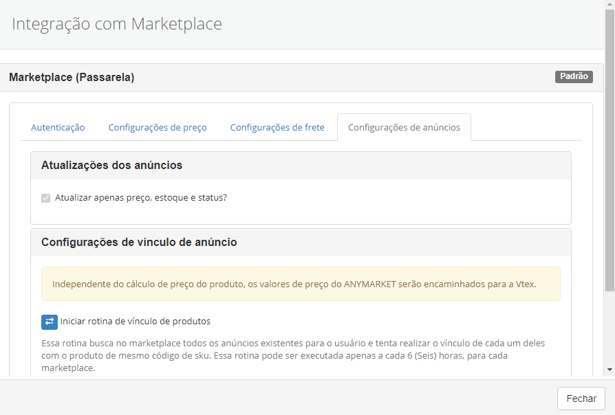 - Atualizar somente preço, estoque e status: Ao ativar essa opção, o ANYMARKET encaminhará somente informações de preço, estoque e status para o Marketplace após o anúncio ativo, ou seja, caso uma imagem do produto no ANYMARKET seja alterada, a imagem do anúncio não será atualizada no marketplace.